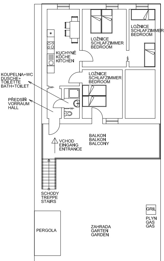 Přívětivý moderně vybavený apartmán s 1 jednolůžkovým pokojem a 2 dvoulůžkovými pokoji v 1.patře rodinného domu, balkon, klimatizace, TV, plně vybavená kuchyně, pergola, plynový gril, i el. i na uhlí, uzavřená zahrada, zahradní nábytek, vybavený zahradní domek pro děti, pískoviště. Nabízíme mimořádně nízké ceny, až o polovinu nižší než v hotelech. Soukromí- celé I.patro pouze pro Vás. Parkování před domem bez problémů.